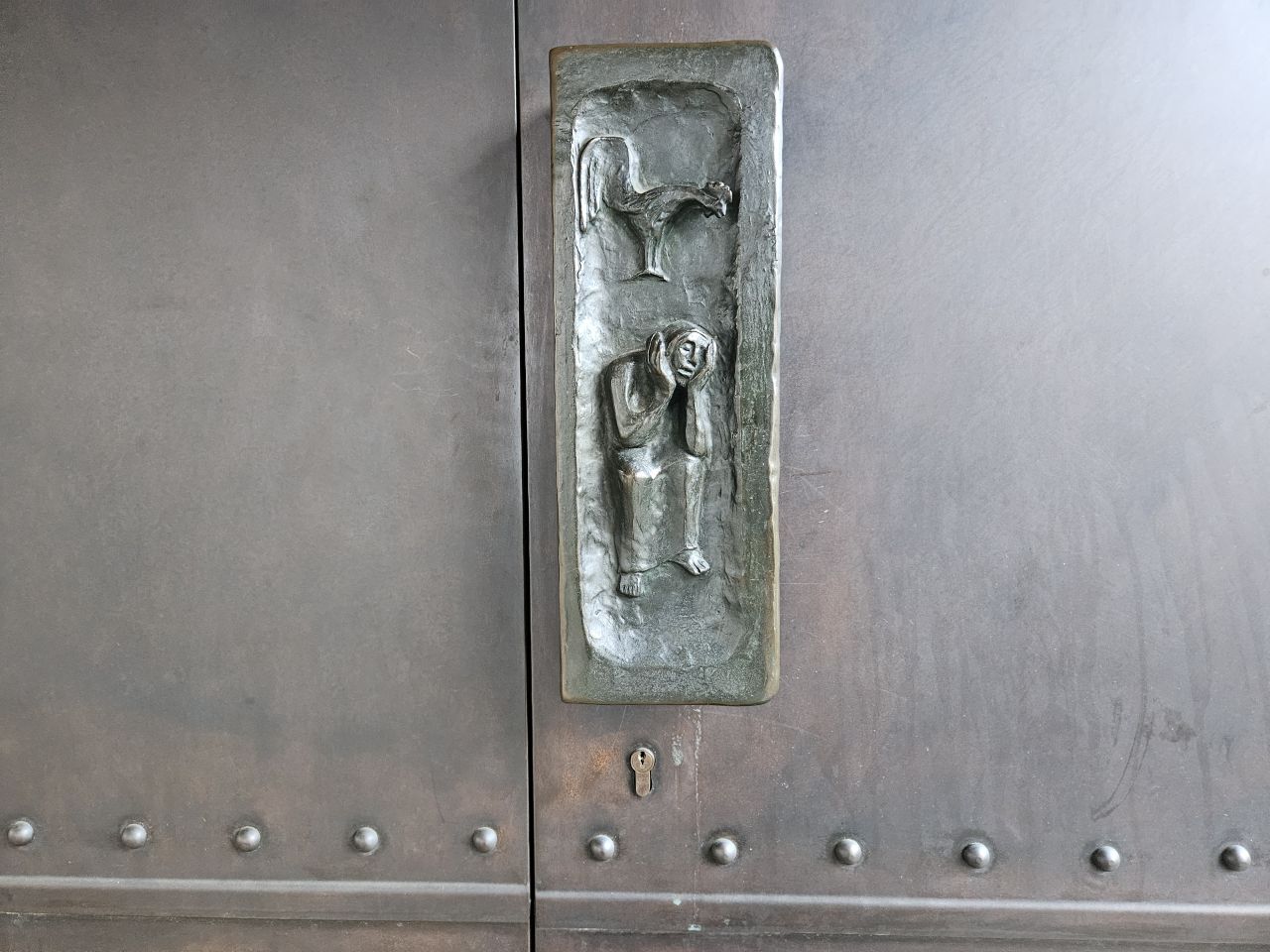 Der Hahn hat es auf viele Kirchen geschafft. Als Wetterhahn, als Mahnung. Auch wir haben einen an der Kirche, als Türgriff an der rechten Kirchentür.