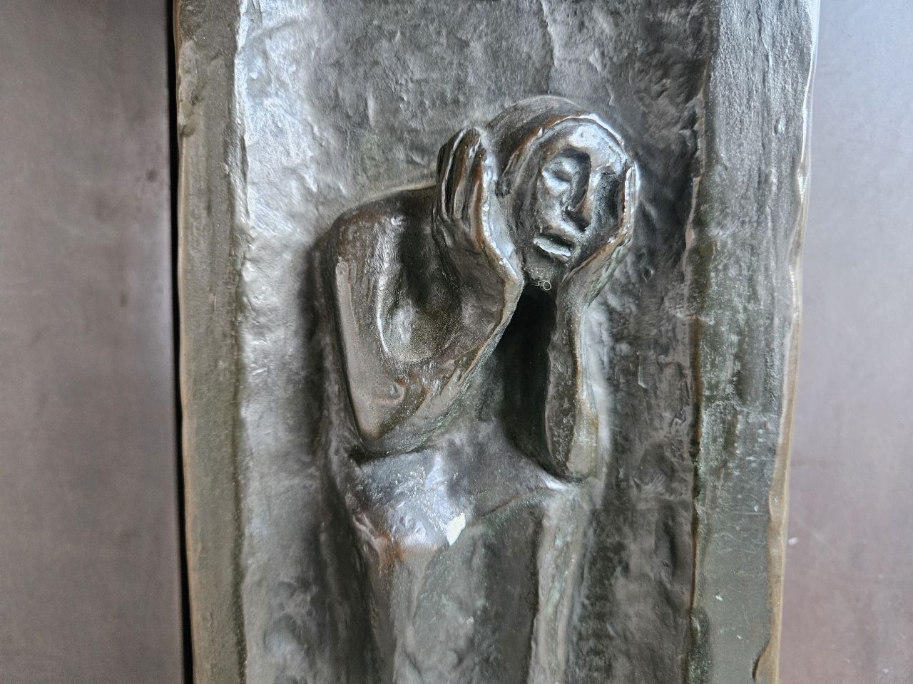 Drei Figuren sind zu sehen: Neben Petrus die Magd, die ihn auf Jesus anspricht und ein Soldat als Vertreter der Staatsgewalt. Wenn der Petrus als Jesus-Anhänger identifiziert, wird es für ihn lebensgefährlich.