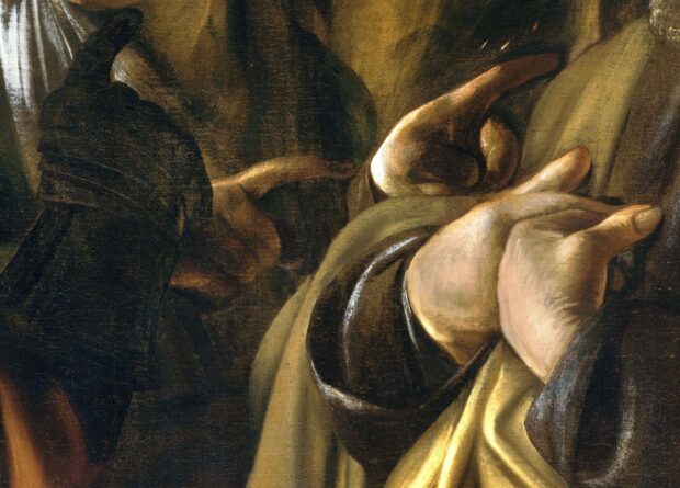 Und dann sind da die Finger. Drei spitze Zeigefinger deuten auf Petrus. Zwei Hände der Magd und der gefährliche Finger des Soldaten. „Man zeigt nicht mit nacktem Finger auf angezogene Leute“, habe ich als Kind öfter gehört. Aber wir können das gut, andere anschwärzen. Schließlich stehe ich dann selbst in besserem Licht da.